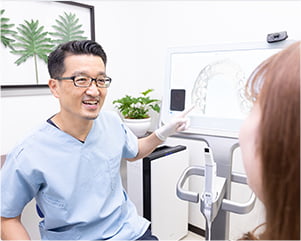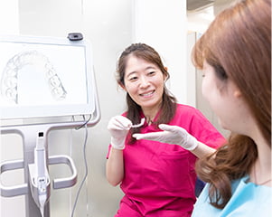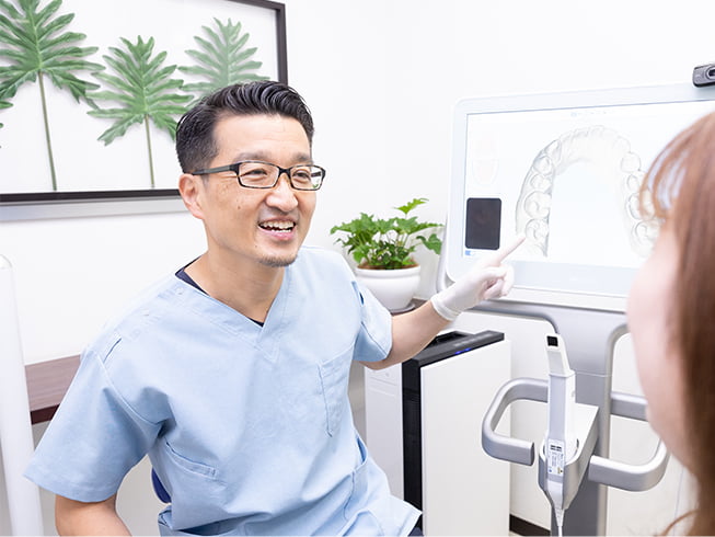 まずはお口の中を拝見し、iTeroを使用して口腔内をスキャンした後に10分程度でマウスピース矯正後の状態をシミュレーション画像でお見せします。この画像をご覧頂き、歯並びにおいて気になる点やご要望を伺い、ご希望される歯並びが実現できるのかを確認いたします。