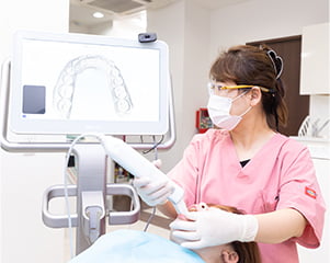 口腔内を診察して虫歯や歯周病がないかどうかを調べた後、問題がなければお顔とお口の写真を撮影し、iTeroを使用して口腔内の細かい部分までスキャンします。